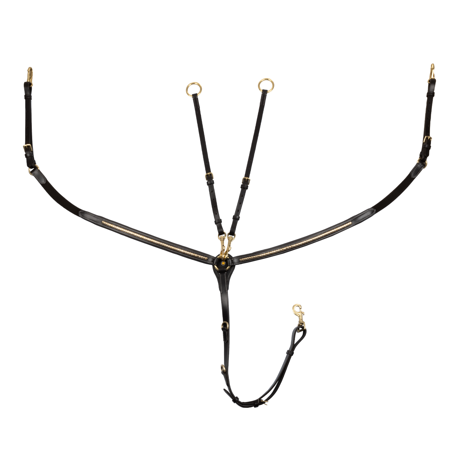 Pettorale con forchetta modello Brass Clincher in pelle conciata. Ideato per limitare i movimenti della testa del cavallo verso l'alto e quelli della sella.